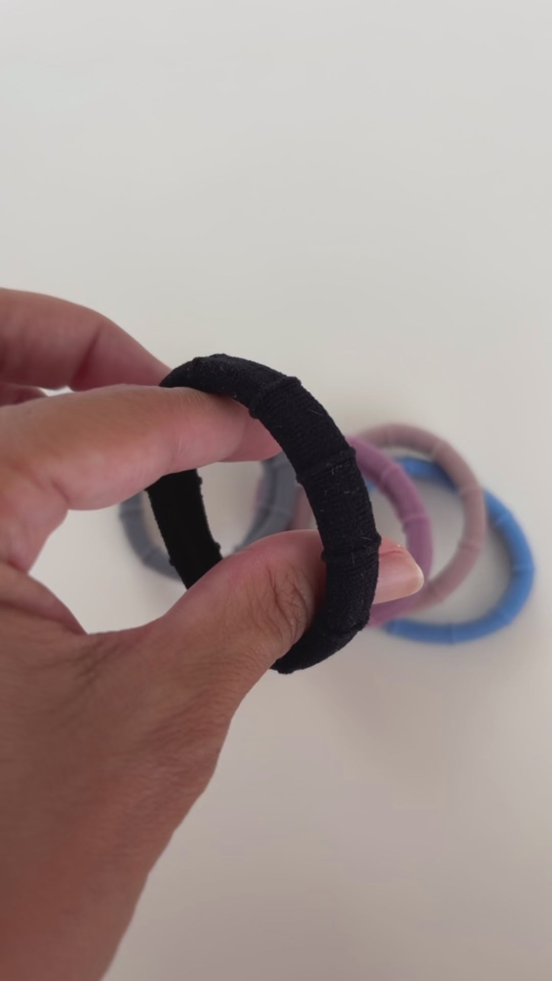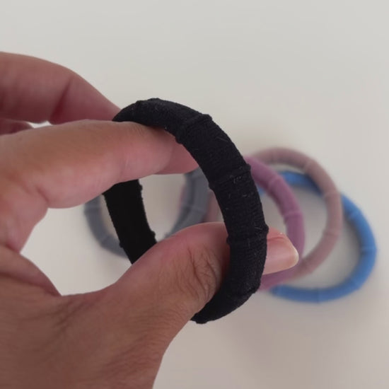 Kit com 5 elásticos nas cores: Preto, Cinza claro, Rosa claro, Bege e Azul claro.